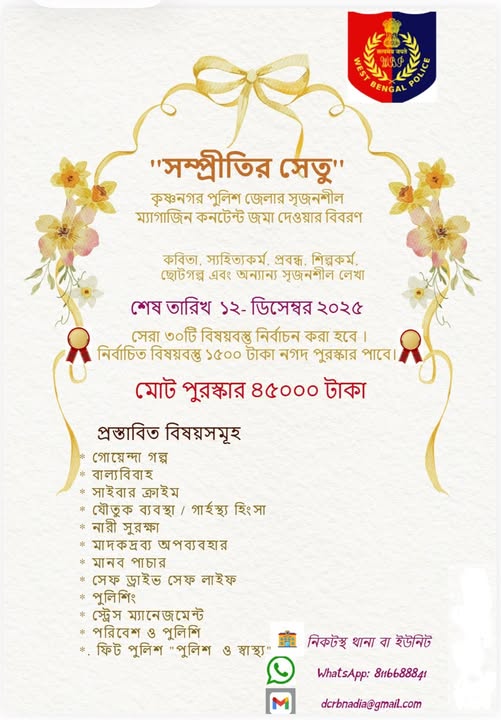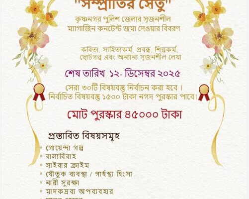 স্টিং সাহিত্য: কৃষ্ণনগর পুলিশ জেলার উদ্যোগে শুরু হয়েছে এক বিশেষ সৃজনশীল প্রতিযোগিতা—‘সম্প্রীতির সেতু’। সমাজে শান্তি, সৌহার্দ্য, সম্প্রীতি ও সুসম্পর্ক বজায় রাখার উদ্দেশ্যে এই প্রতিযোগিতার আয়োজন করেছে জেলা পুলিশ প্রশাসন। কবিতা, সাহিত্যকর্ম, প্রবন্ধ, রচনা, ছবি, ছোটগল্প এবং অন্যান্য সৃজনশীল লেখার মাধ্যমে অংশ নিতে পারবেন জেলার সাধারণ মানুষ। প্রতিযোগিতার শেষ তারিখ ১২ ডিসেম্বর ২০২৫। প্রতিযোগীরা নির্ধারিত তালিকা…